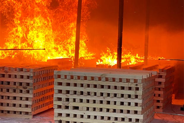 Wir führen drei Großbrandversuche in einem Raum mit rund 20 Quadratmetern durch und zwei in Räumen mit rund 40 Quadratmetern. Der erste Versuch ist Referenzversuch und stellt ein nichtbrennbares Gebäude dar (Mauerwerk, Stahlbeton). Der zweite stellt einen Raum aus Massivholz dar, die Wände sind mit 18 mm Gips-Feuerschutz-Platten bekleidet - wie im Entwurf der neuen Holzbaurichtlinie beschrieben.