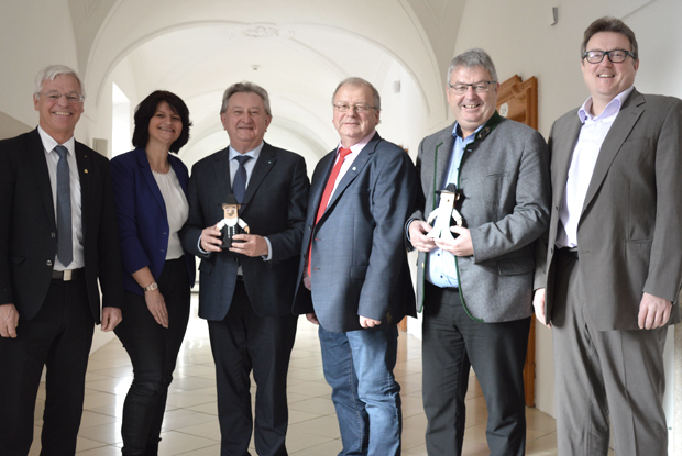 LIV-Präsident Peter Aicher, Unternehmerfrau Christine Schiller (v.l.) und Bezirksvorsitzender Anton Schiller (r.) bedankten sich bei Landrat Franz Meyer, Max Baar und Bürgermeister Harald Mayrhofer (ab 3.v.l.) für die Teilnahme.