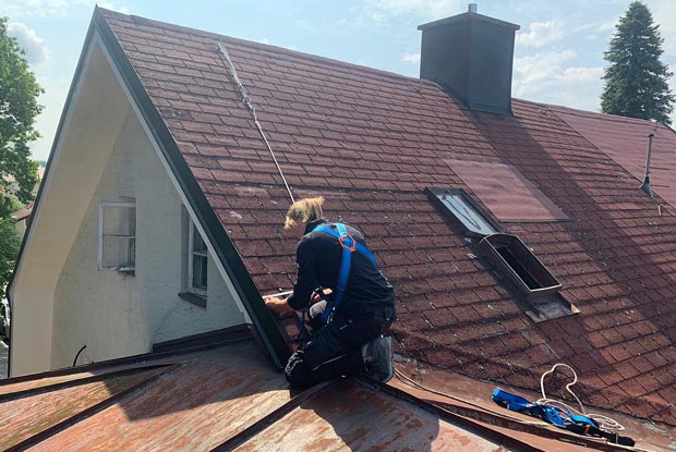 Gut abgesichert im Klettergurt misst die angehende Zimmerin das alte Dach aus. Es bekommt einen neuen Dachstuhl.