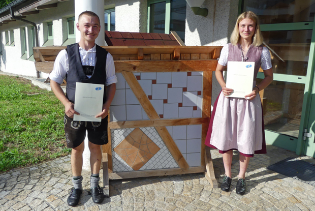 Stolz präsentieren Christina Hartl (r.) und Maxi Kirr (l). ihre Abschlusszeugnisse vor der Berufsschule Traunstein I – die beiden haben die Zimmerer-Ausbildung erfolgreich abgeschlossen und ihre Gesellenbriefe erhalten.