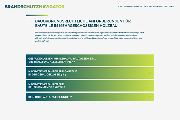 Holzbauprojekte erfordern besondere Kenntnisse im Brandschutz. Mit dem Brandschutznavigator werden wir unseren Mitgliedsbetrieben ein Online-Tool zur Verfügung stellen, dass Planer durch die baurechtskonformen Möglichkeiten des Holzbaus führt. Entwickelt auf Basis umfangreicher Forschung an der Technischen Universität München, informiert das Tool über Feuerwiderstand, erforderliche Nachweise und die Übereinstimmungsbestätigung nach Bauabschluss.