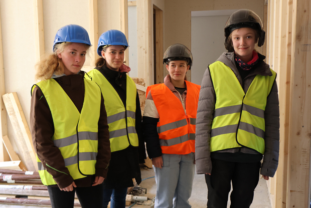 Auf der Baustelle waren auch die vier „Girls“, die den Aktionstag bei Holzvogel GmbH im unterfränkischen Theres zubrachten – doch das war erst die dritte Station, die die Teenager an dem Tag zu absolvieren hatten. Zuvor gab es Einblicke in die Tätigkeiten der Abteilung für Bauzeichnung und Planung. Das vermeintliche Highlight fand jedoch gleich zu Beginn statt: Nach einem Rundgang über das gesamte Gelände konnten die 12- bis 14-Jährigen in der Produktion selbst aktiv werden und ein eigenes Vogelhäuschen bauen. Bei allen Tätigkeiten stand eines immer an erster Stelle: der Spaß.