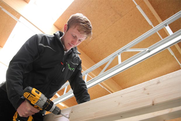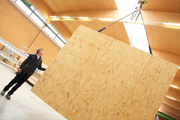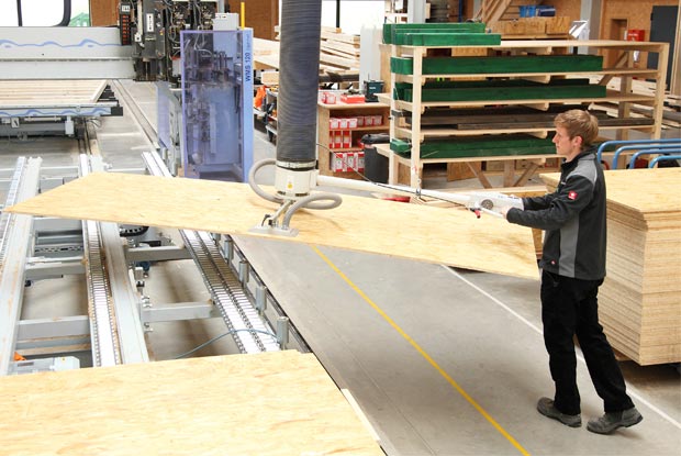 Am Montagetisch bereitete Johannes Hertle Elemente für ein Haus vor.