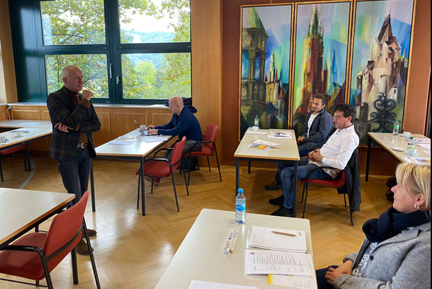 Gemeinsam mit den Referenten unserer Partner secum (Ulrich Müller, stehend) und der BG BAU (Peter Murnauer, 1.v.l. sitzend) haben die Teilnehmer Gelegenheit, Art und Umfang der Arbeitsschutzorganisation und neuralgische Punkte zu erörtern.