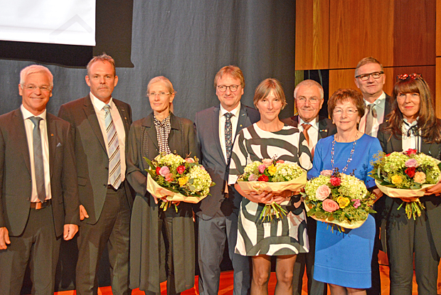 Präsident Peter Aicher (l.) gratulierte den Geehrten (v.l.) Prof. Marco Einhaus, Prof. Stefan Winter, Xaver Haas und Hans Feser sowie ihren Frauen.