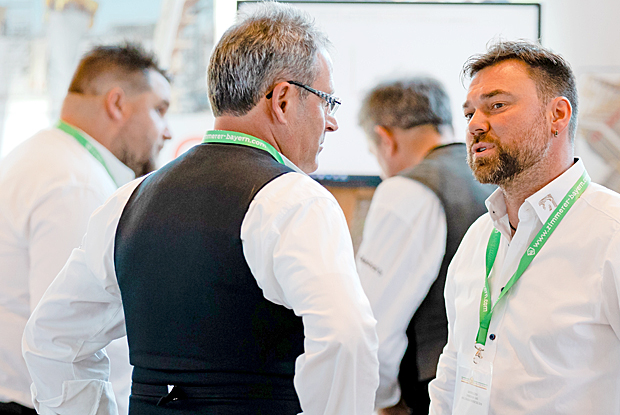 Im Foyer der Kongresshalle kamen die Zimmerer unter sich und mit Ausstellern ins Gespräch.