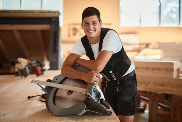 Wie er die Kreissäge sicher bedient, damit kennt sich der Zimmerer-Azubi aus.