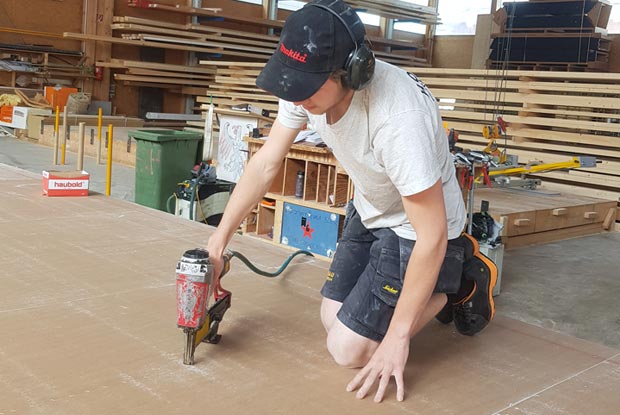 Mit dem Drucklufttacker befestigt Harder die Bekleidung auf der Holzständerwand.