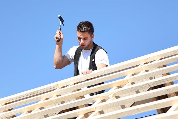Zimmerer auf dem Dach sind der Sonne besonders ausgesetzt. Wer sich dagegen nicht schützt und häufig einen Sonnenbrand hat, steigert sein Risiko Hautkrebs zu bekommen. Im Interview erklärt der stellv. Leiter der Hauptabteilung Prävention der BG BAU, Prof. Frank Werner, warum weißer Hautkrebs die häufigste Berufskrankheit bei BG-Versicherten ist und wie viele Esslöffel Sonnencreme benötigt werden, um den ganzen Körper einzuschmieren.