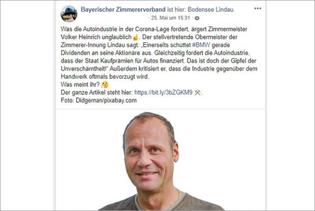 Mit so viel Rückenwind hätte der stellvertretende Obermeister der Zimmerer-Innung Lindau Volker Heinrich nicht gerechnet. Vor kurzem hat er kritisiert, dass die Autoindustrie staatliche Kauprämien fordert. In den sozialen Medien bekam er dafür viel Zuspruch. In Zukunft will er sich als Gemeinderat für klimafreundliche Konjunkturmaßnahmen einsetzen.