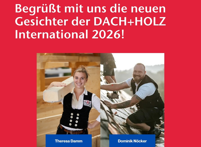 We proudly present: die neuen Gesichter der DACH + HOLZ International 2026 : Zimmerer-Gesellin Theresa Damm und Dachdeckermeister Dominik Nöcker! Mit ihrer Leidenschaft und ihrem Know-how sind sie die perfekten Botschafter für die Branchenmesse.